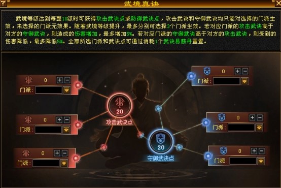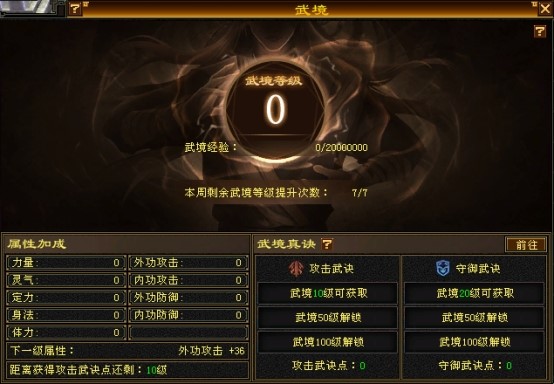 注:开启武境养成后,少侠再获得经验将一分为二,分别为50%的普通经验和50%的武境经验,武境经验可提升武境等级后获取属性及武境真诀;当少侠武境等级落后于服务器武境等级时,获取武境经验时会有相应加成。