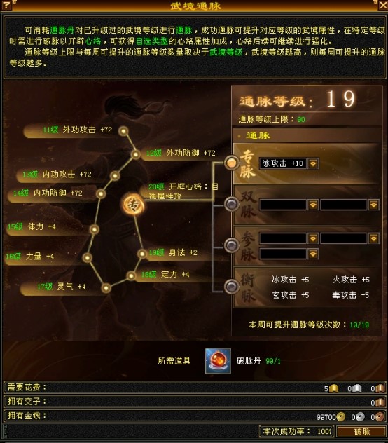 武境通脉:武境通脉需要消耗通脉丹,在成功通脉后,对应等级的武境属性将会强化。通脉达到指定等级后需要破脉,破脉成功即可开辟心络并自选属性进行加成。